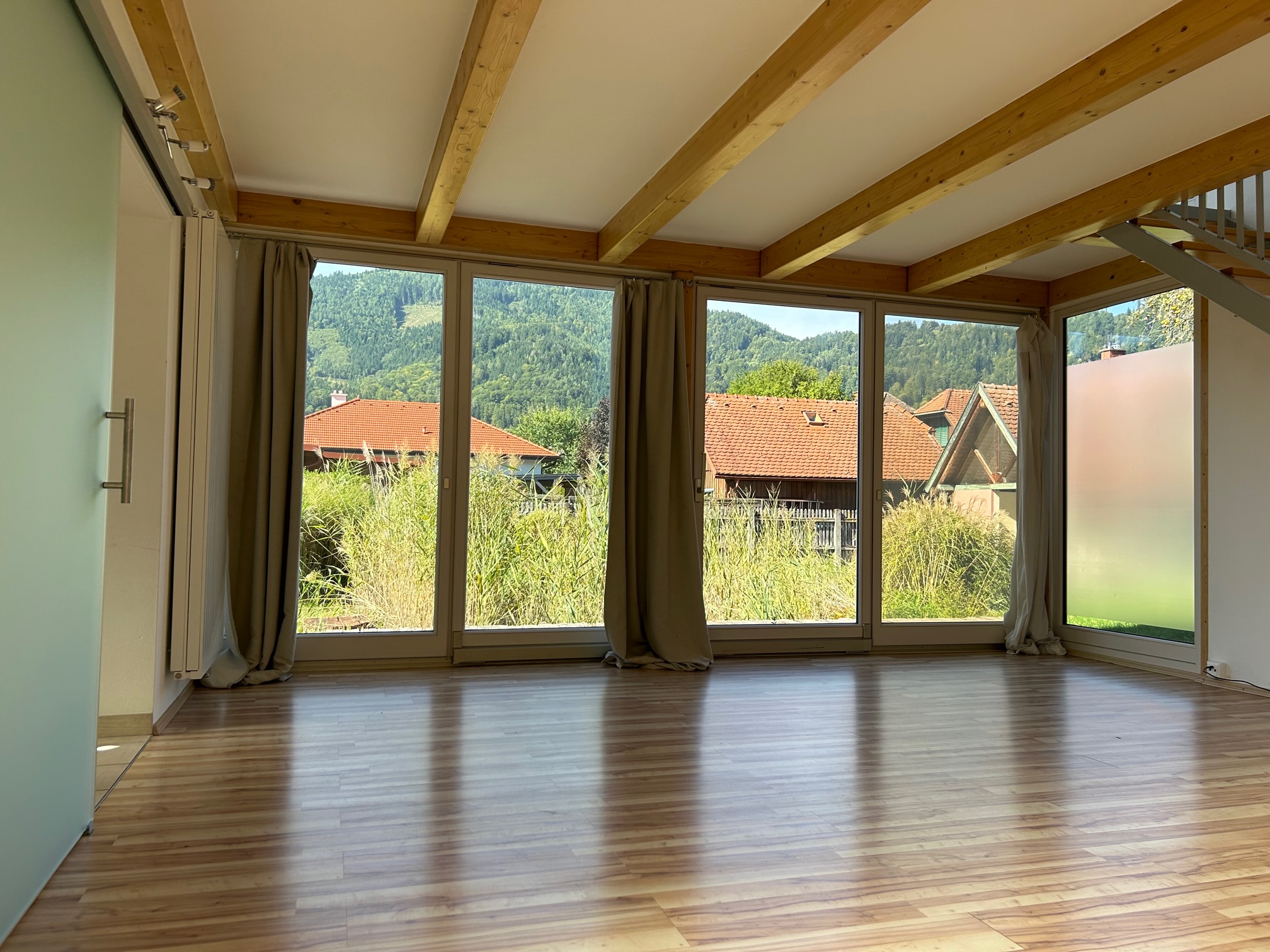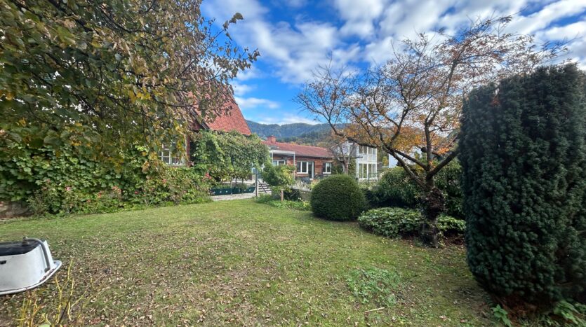 Durch die bodentiefen Fensterflächen (Schiebetüren) haben Sie einen wunderbaren Ausblick in den idyllisch angelegten Garten – finden Sie hier Ruhe, Kraft und Entspannung.